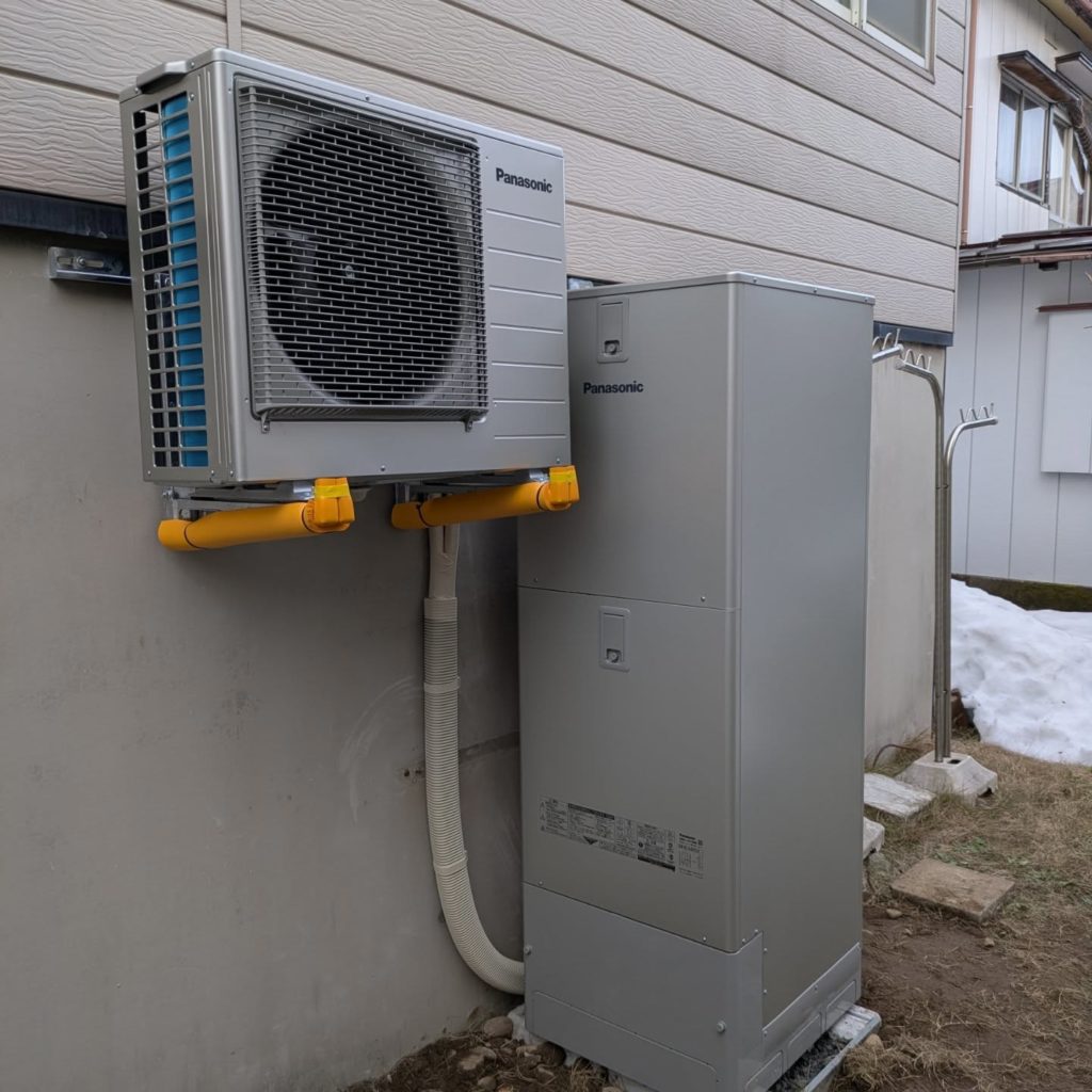 ヒートポンプユニットは雪に埋もれないように高い位置に設置しました。